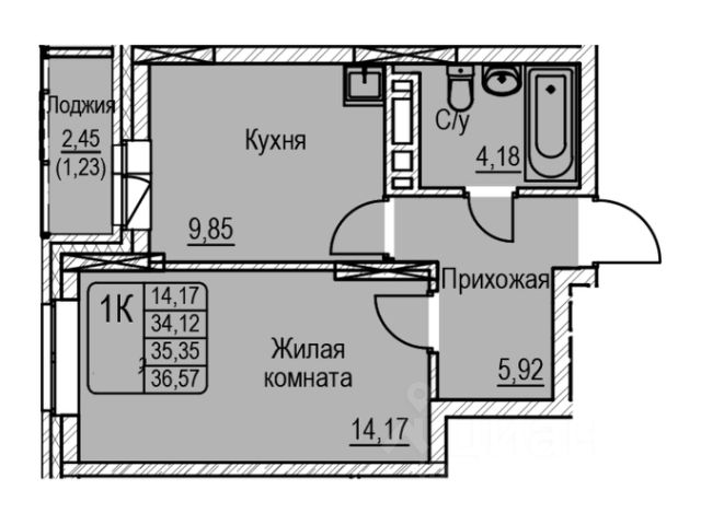 - Общая площадь 36.6 м2