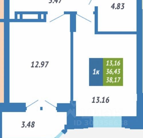 - Общая площадь: 37 м2
