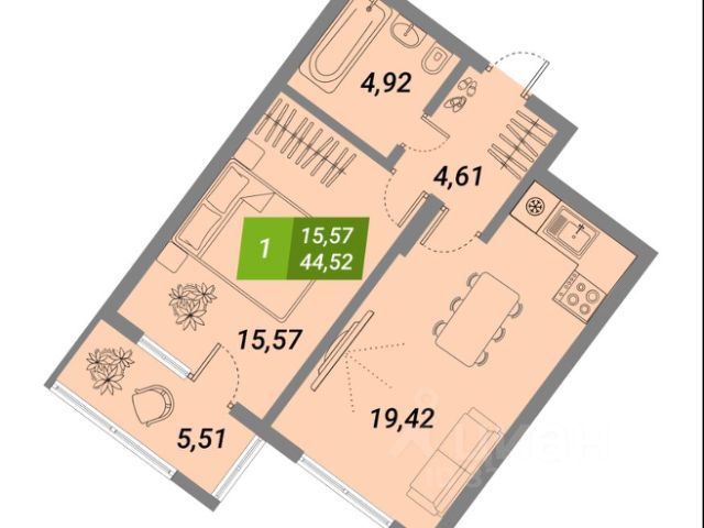 - Общая площадь 44.5 м2