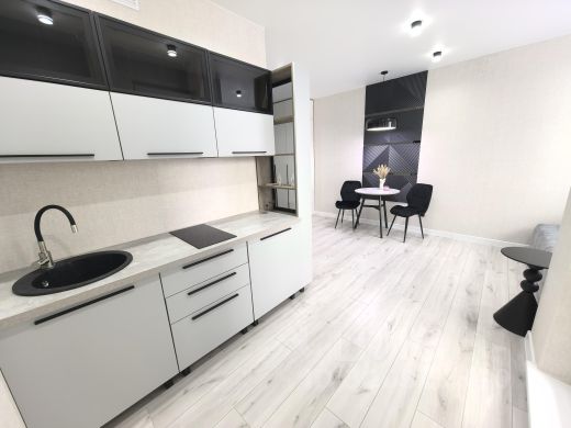 В продаже студия с мебелью и стильным ремонтом. Хорошая планировка, просторная зона гостиной, нет ощущения замкнутости. Удачное расположение окон: светло весь день, но не попадает палящее солнце, в квартире комфортно даже в жаркие дни. О квартире: В ванной дорогой широкоформатный керамогранит Italon, душевая система с подсветкой и индикатором температуры, тропическим душем, гигиенической лейкой. Под столешницей выделено место под стиральную машину (выводы все подготовлены). Установлена хорошая межкомнатная дверь фирмы Albero. В комнате на полу влагостойкий ламинат Kastamonu, зонированное освещение (входное, зона кухни, гостиной и атмосферное освещение только обеденной зоны). Диван раскладывается в полноценное спальное место для двух человек, при этом не загромождая пространство. Кухонный гарнитур с витринным шкафом для отделения зоны приготовления и не создавать визуальный шум, встроенная варочная поверхность и встроенные в столешницу розетки, выделено место под микроволновую печь в нижнем шкафу. Уютнейшая лоджия для вечерних душевных посиделок, чтения книг или утренней чашечки кофе в подвесной качеле. Чистая продажа, без обременений, совершеннолетний собственник, просмотры в удобное время по предварительной договоренности.