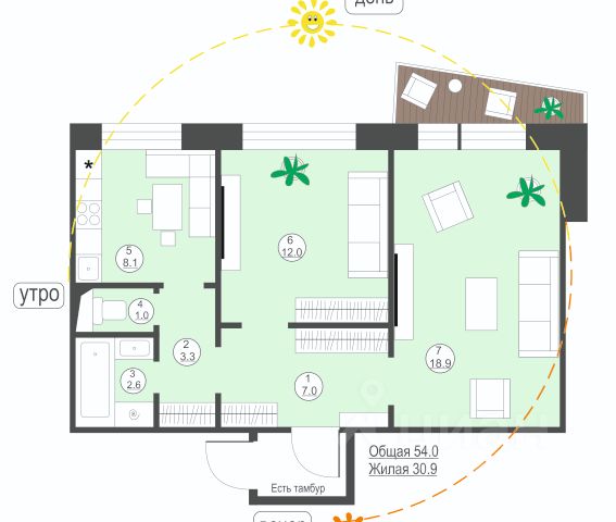 - Общая площадь 54 м2