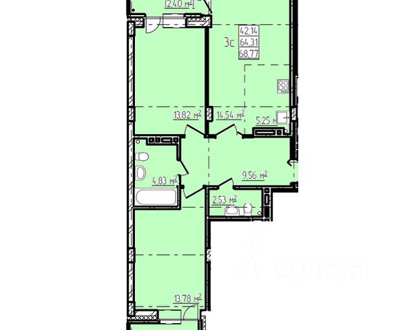 - Общая площадь: 64.3 м2