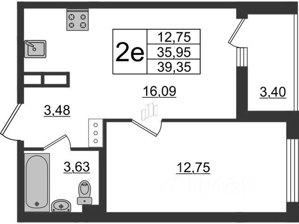 - Общая площадь: 39.4 м2
