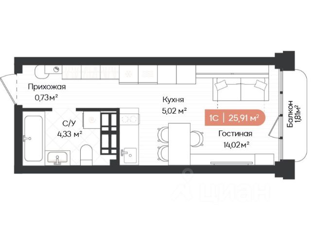 - Общая площадь: 24.6 м2