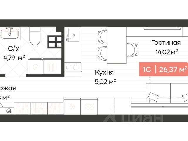 - Общая площадь 26.4 м2