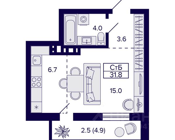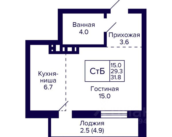 - Общая площадь 31.8 м2