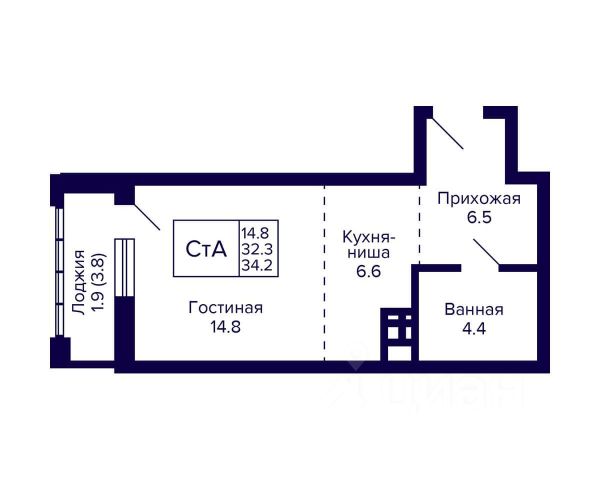 - Общая площадь 34.2 м2