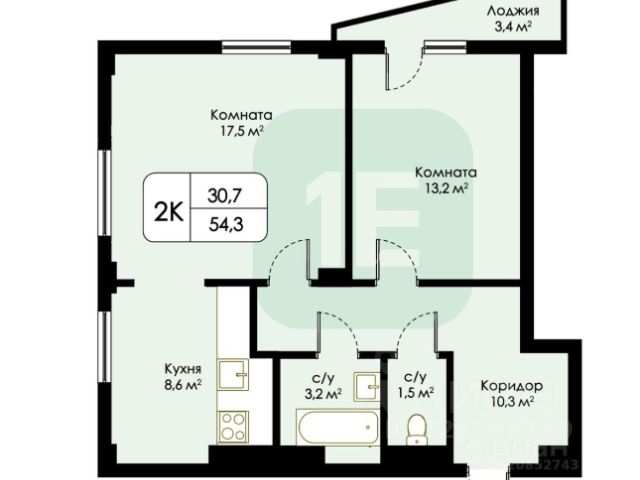 - Общая площадь: 54.4 м2
