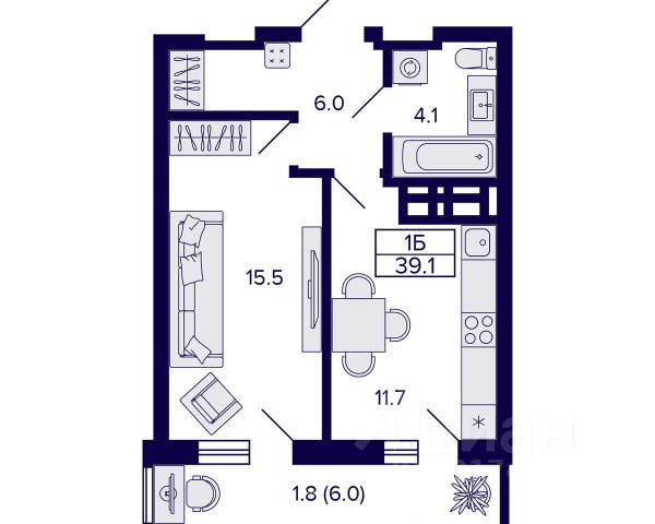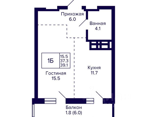 - Общая площадь 39.1 м2
