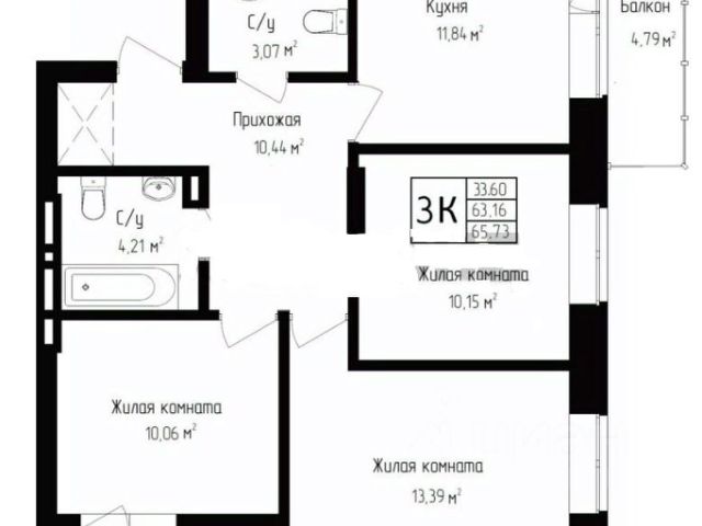 - Общая площадь 62.9 м2