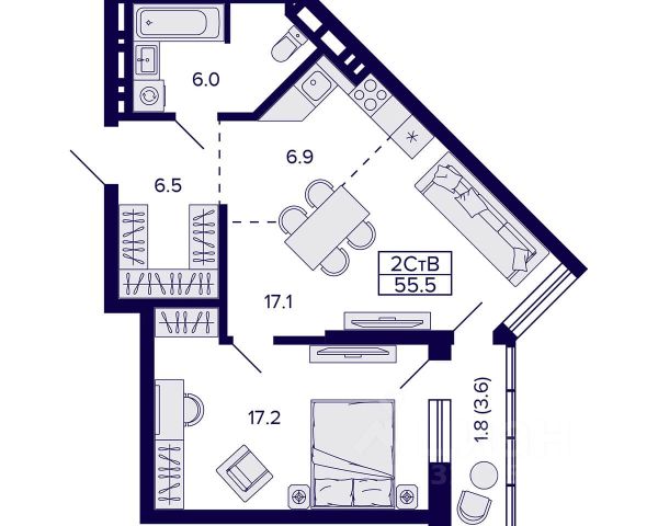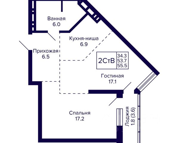 - Общая площадь: 55.5 м2