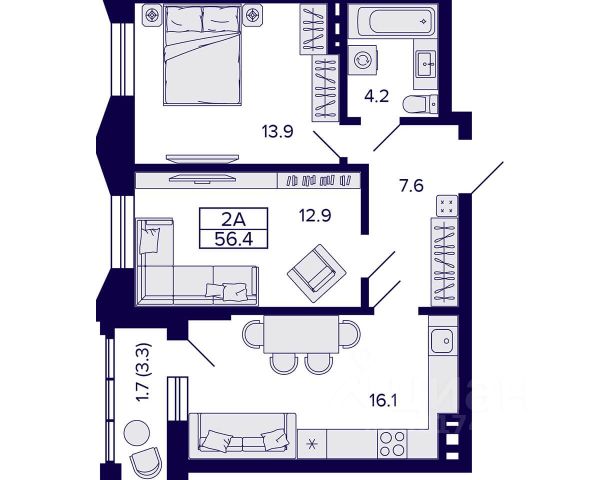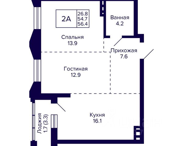 - Общая площадь: 56.4 м2